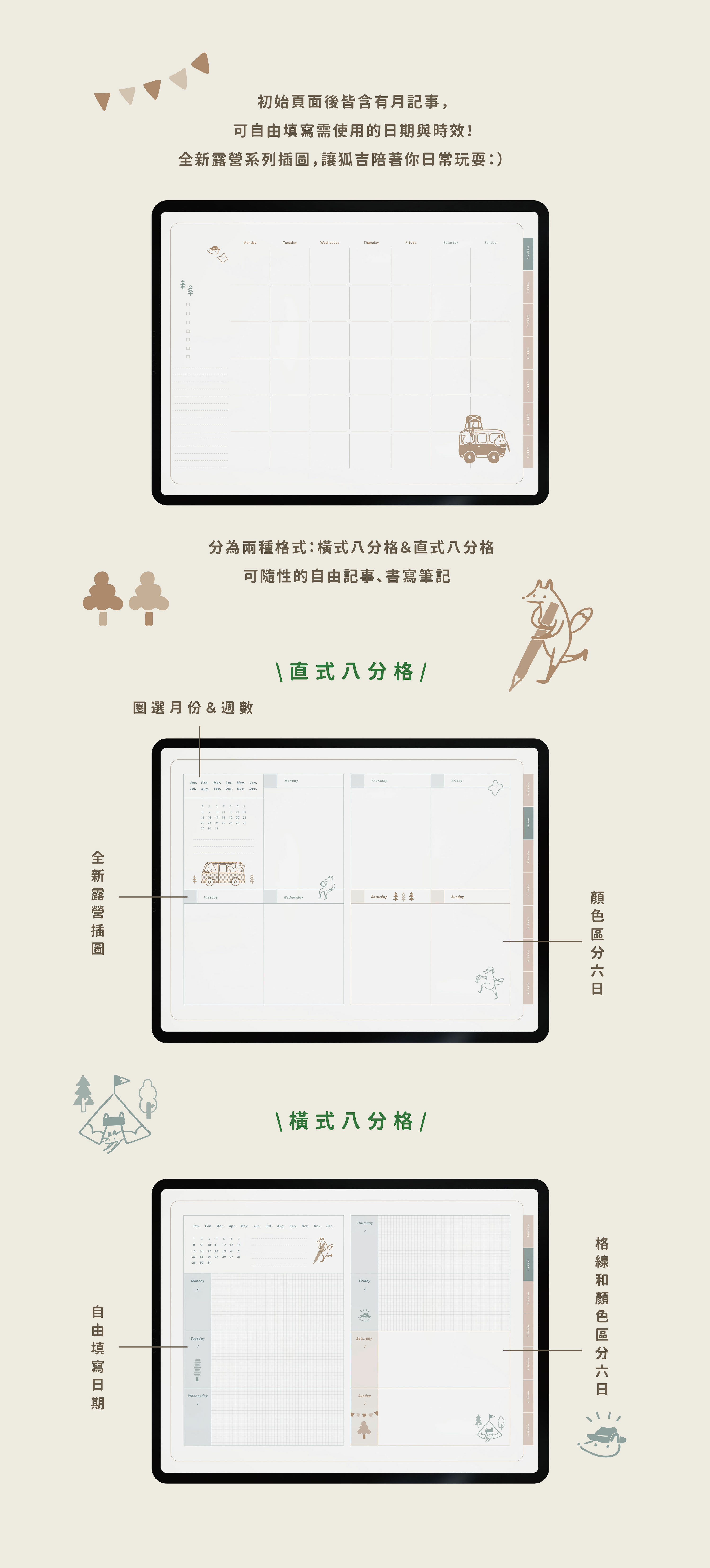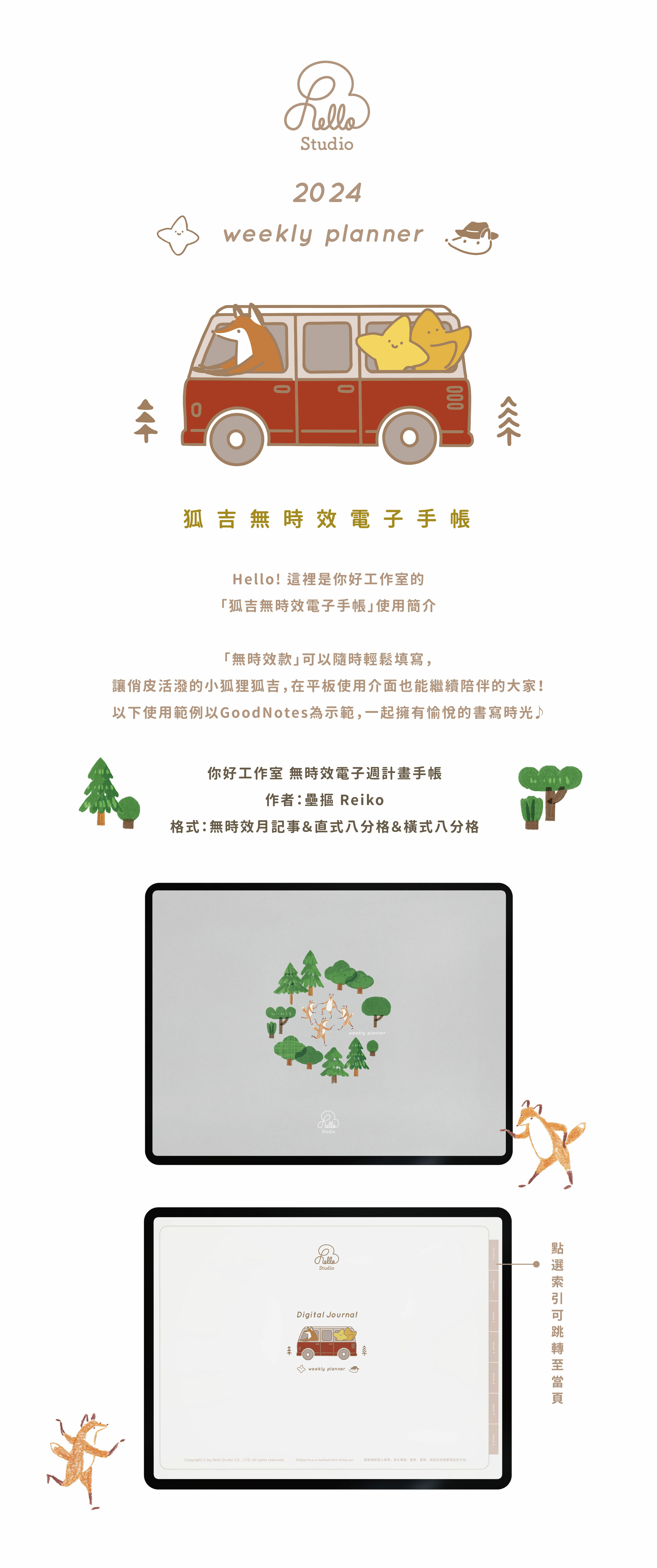 新的一年推出全新的電子手帳,讓俏皮活潑的小狐狸狐吉,在平板使用介面也能繼續陪伴的大家。