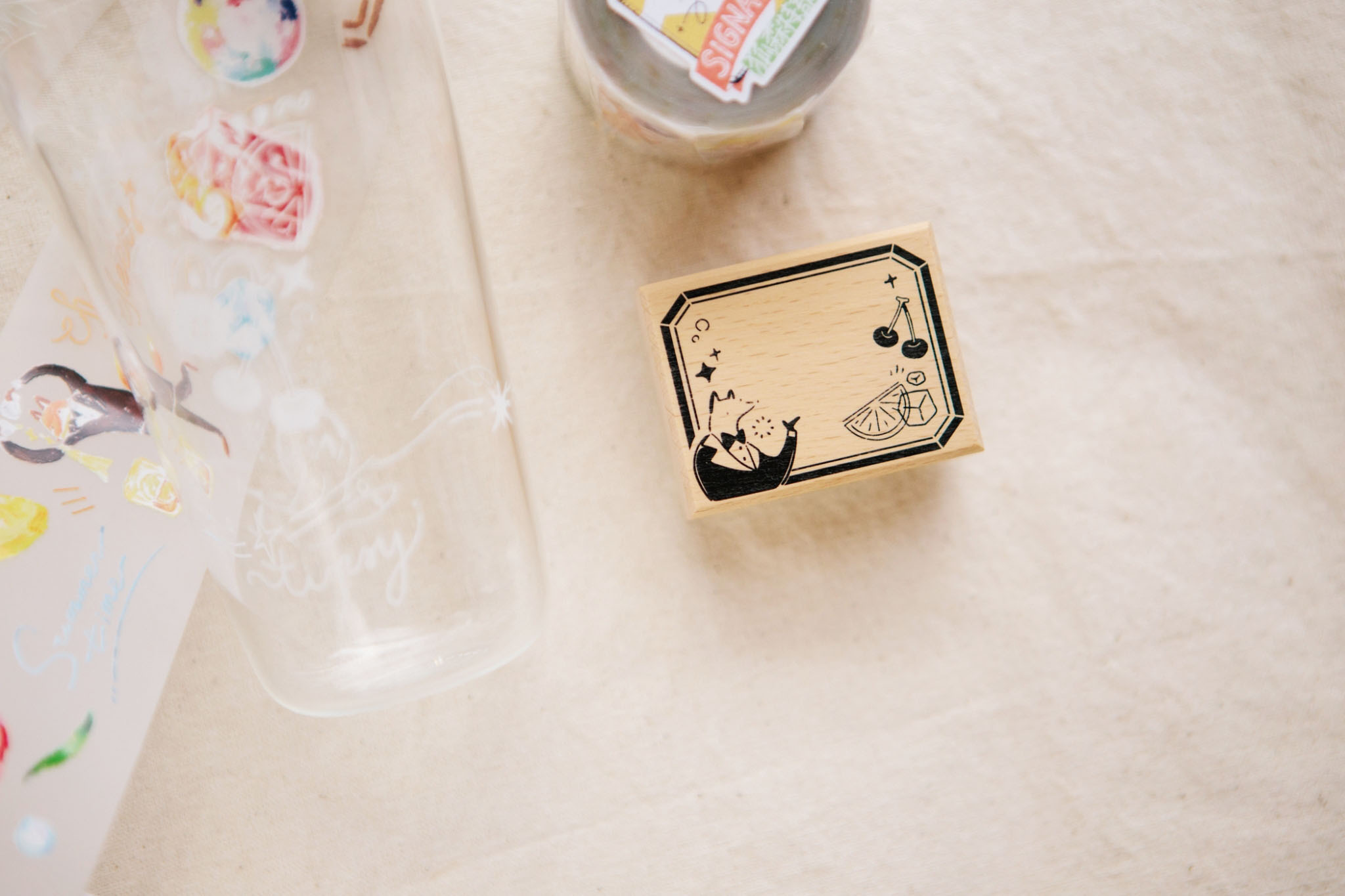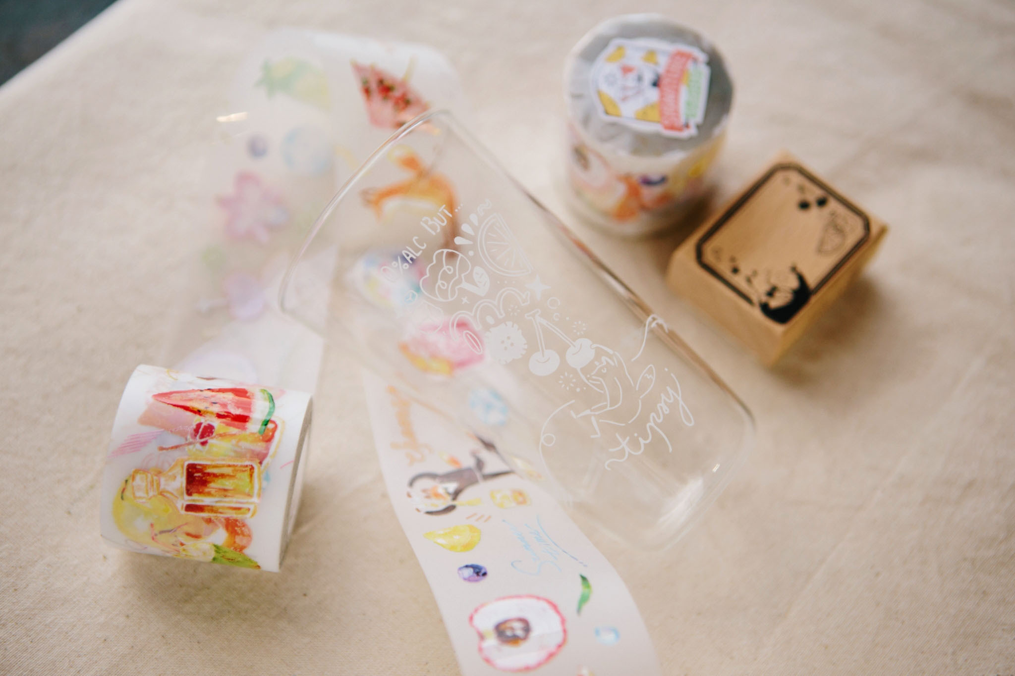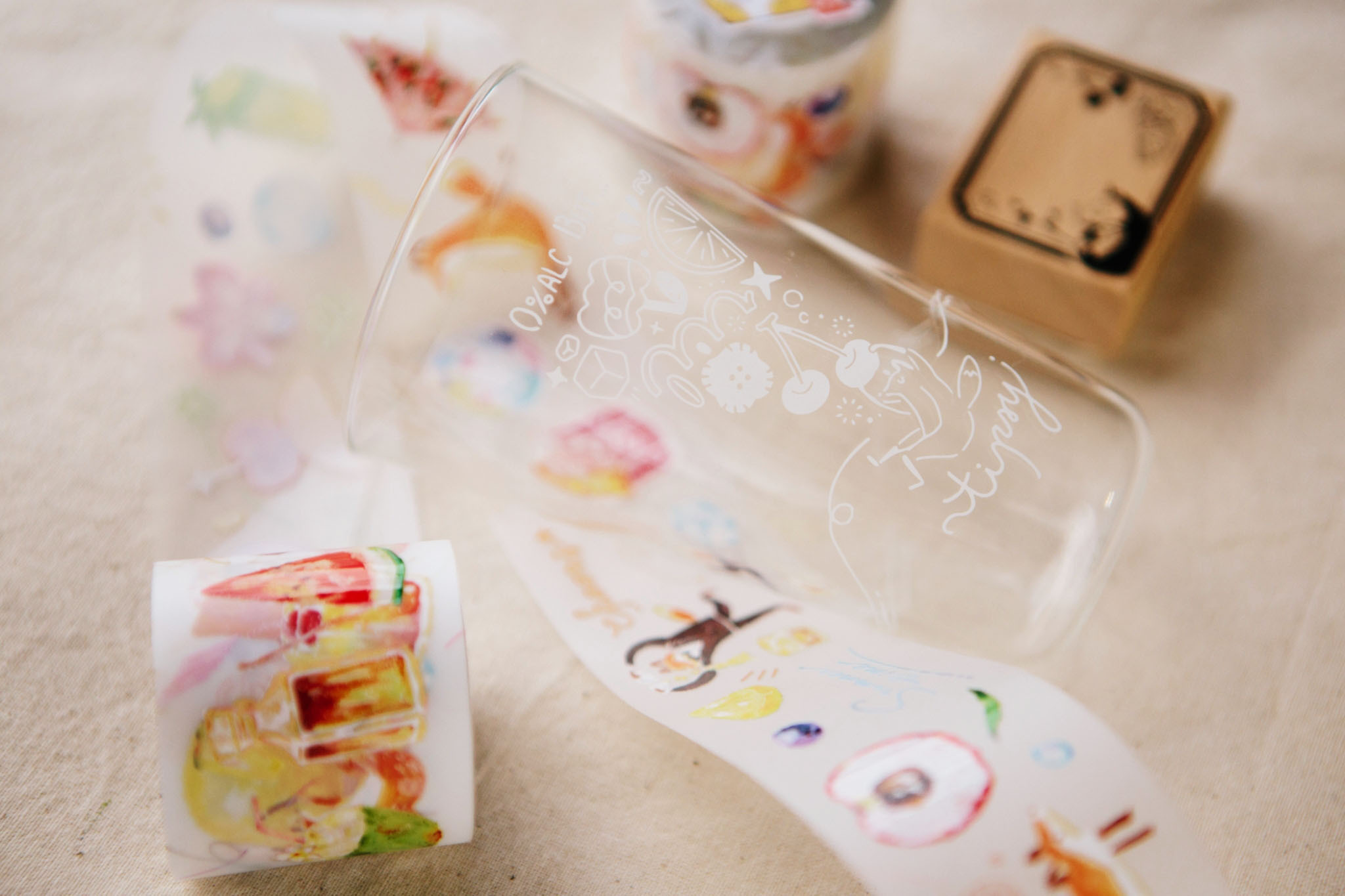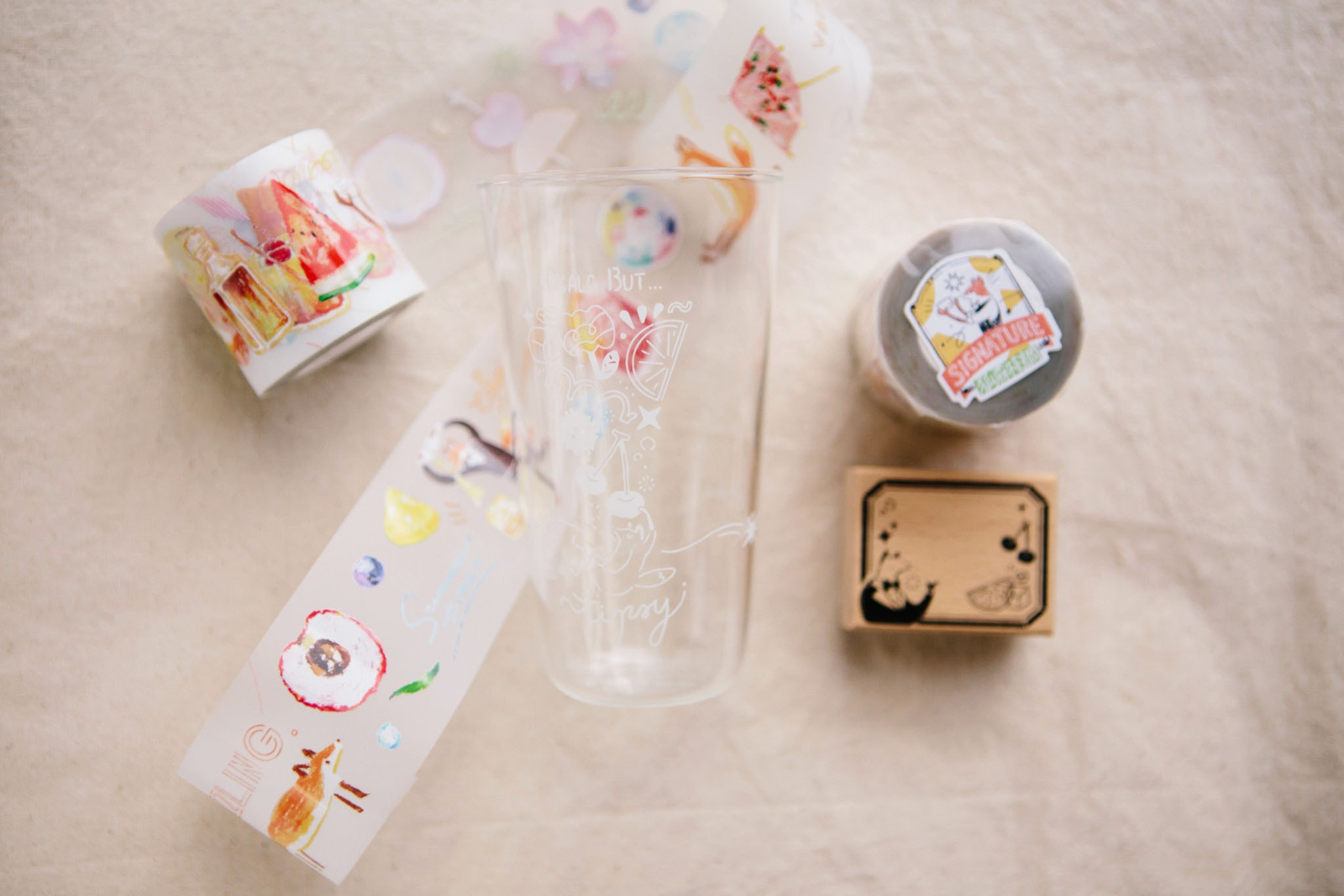 玻璃水杯x1、印章x1、貼紙x1、PET膠帶x1、明信片x1