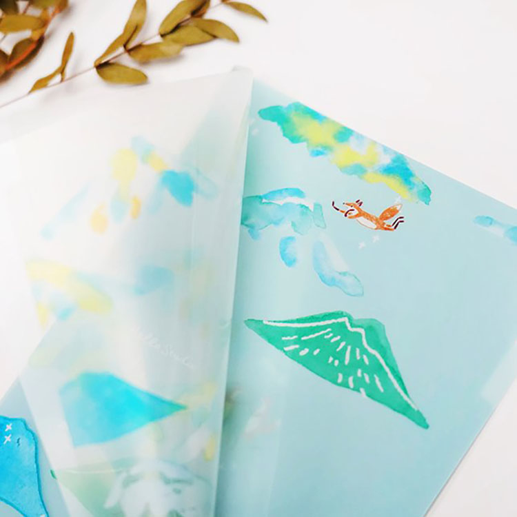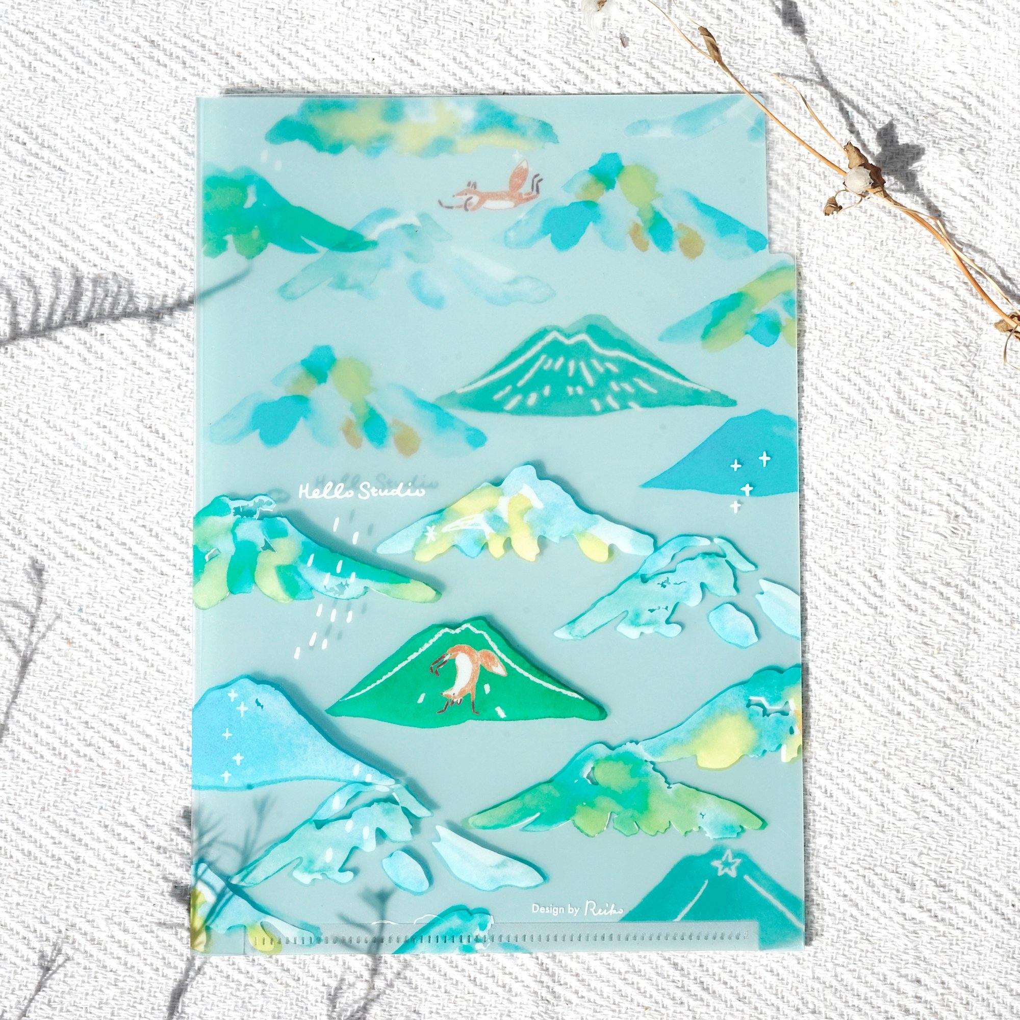 半透明的淺淺藍綠色,透出一層層水彩繪製的小山脈插圖,